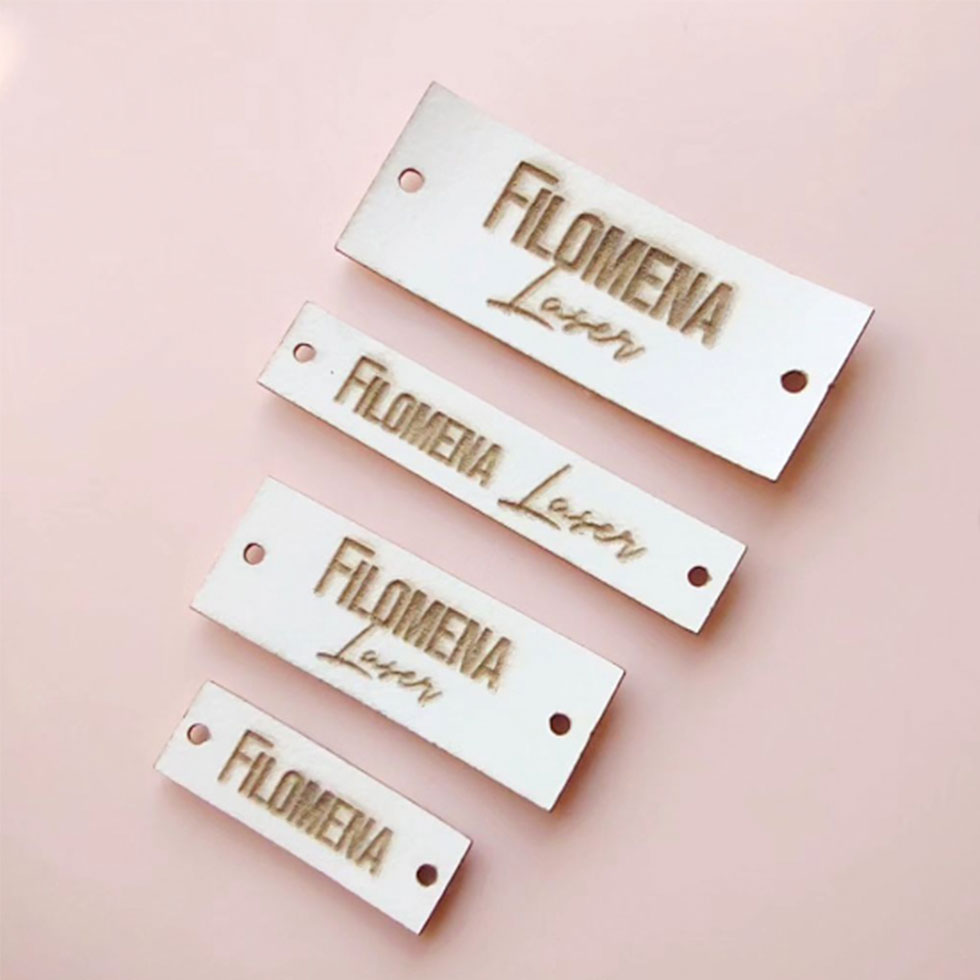 Realizamos etiquetas, apliques, dijes y avíos varios a partir del corte y grabado láser de cuero PU y acrílico.