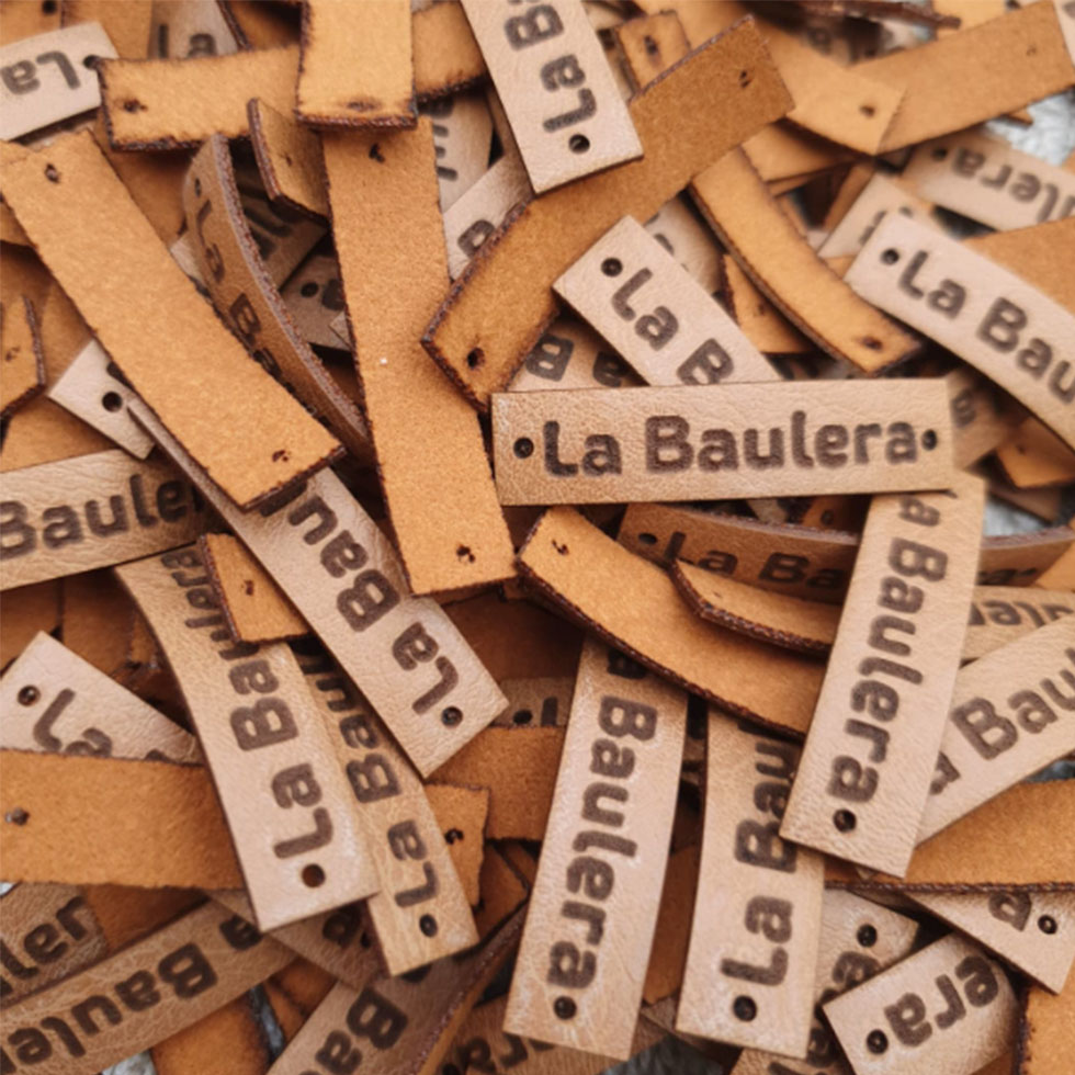 Etiquetas de eco-cuero con corte láser. Etiquetas de raso con transferencia térmica.